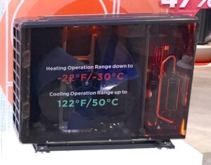 Navien was also showcasing another interesting technology. An outdoor unit that includes a water misting system to improve efficiency (NAV Hydro AC). Spraying a fine mist of water on the outdoor unit to help with cooling is not a new idea. That said, this is the first product I have seen that incorporates this technology from the factory. What is the impact? The outdoor unit is rated at 19 SEER2, which is a top-tier rating. When the mist is activated, the SEER2 rating jumps to over 28 SEER2. That’s impressive.